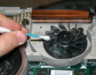 čišćenjem laptopa od prašine, zamenom termoprovodne paste i podloški , podmazivanjem